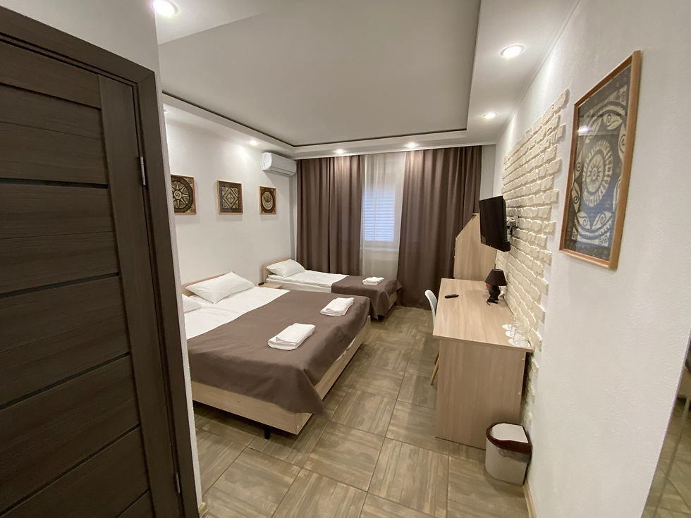 Мы проживали семьёй малыш двух лет и трое взрослых. Очень понравилось расположение, приветливая хозяйка, все рассказала и показала. В нашем номере с одной большой кроватью и двухъярусной кроватью было все прекрасно. Пол кафель, не скользко с подогревом, сначало переживала, что малышу будет холодно, но пол с подогревом)))🤪. Есть чайник и чайные принадлежности. Кондиционер. В отеле есть общая мини кухня с холодильником и микроволновой, море различных посудных принадлежностей на все случаи жизни. А также гладильная доска с утюгом😀Хотелось бы, чтобы была мини плита, хотя бы электрическая. Чтобы можно было поджарить утром яичницу или сварить кашу))).Спасибо большое, ещё приедим.